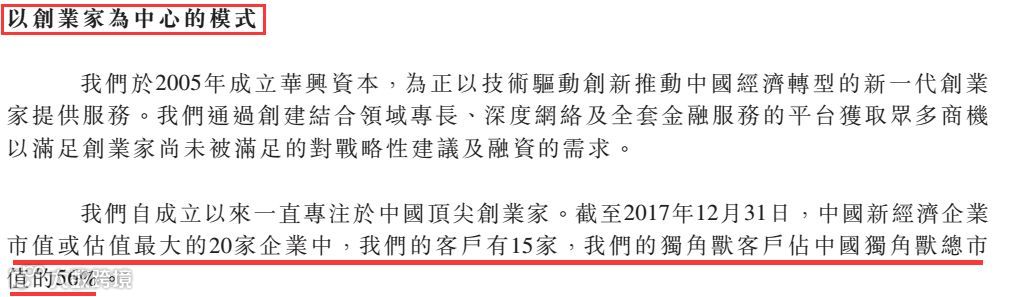 “我们自成立以来一直专注于中国顶尖创业家。截至2017年12月31日,中国新经济企业市值或估值最大的20家企业中,我们的客户有15家,我们的独角兽客户占中国独角兽总市值的56%。”华兴资本在招股书中这样表述。