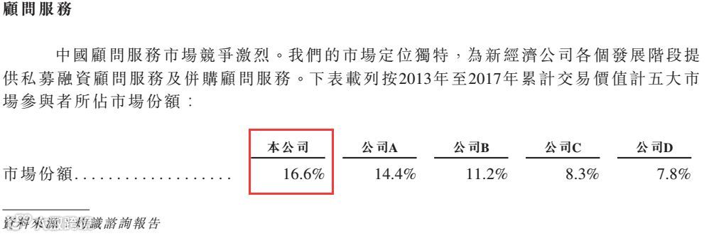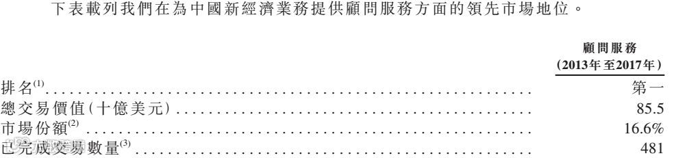 顾问服务:2013年至2017年按新经济交易额计排名第一,截全2018年3月31日提供顾问服务的累计交易额为902亿美元。