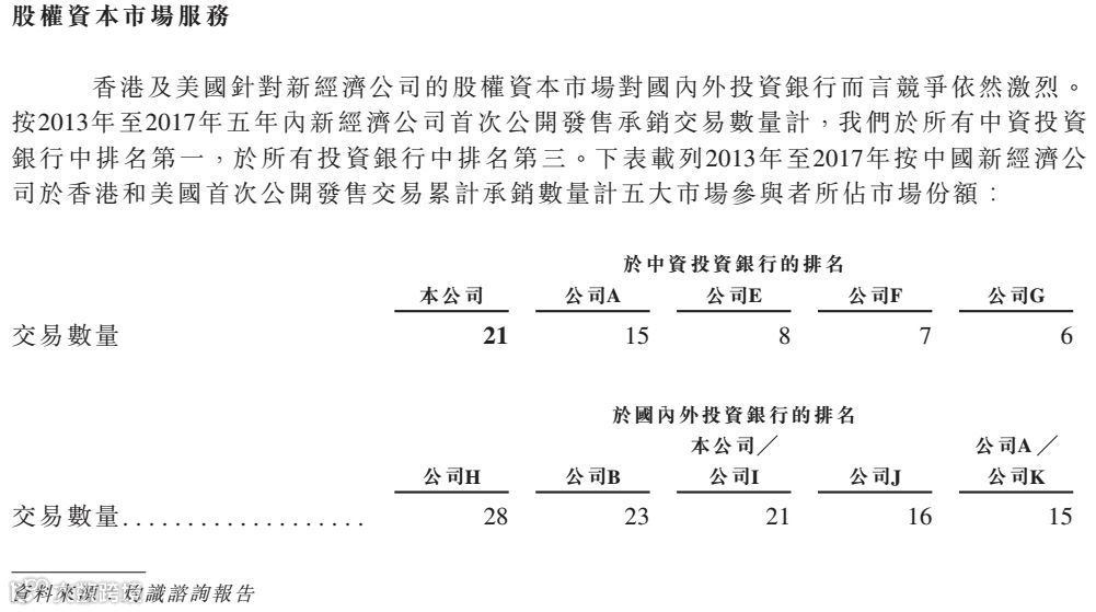 承销:2013年至2017年五年期间为中国新经济公司承销的香港及美国首次公开发售数量在中国投资银行中排名第一,在中外投资银行中排名第三。