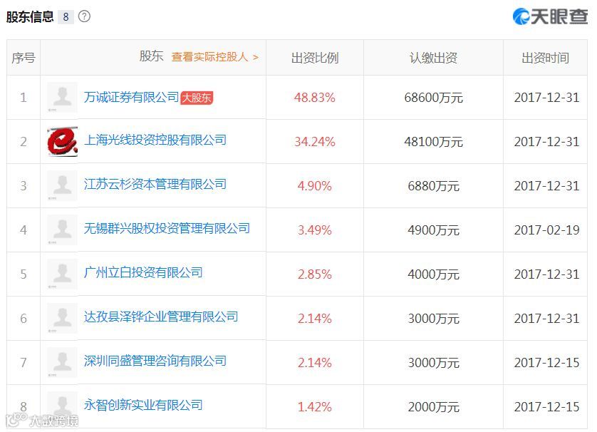 根据天眼查信息,华菁证券共有8为股东,大股东为万诚证券,万诚证券则是华兴资本全资控股的子公司;另一大股东为上海光线投资控股有限公司,资料显示,上海光线投资控股有限公司是一家以文化产业投资、多媒体产品及相关技术研发等为主营业务的公司,为上市公司北京光线传媒股份有限公司(300251)的控股股东。