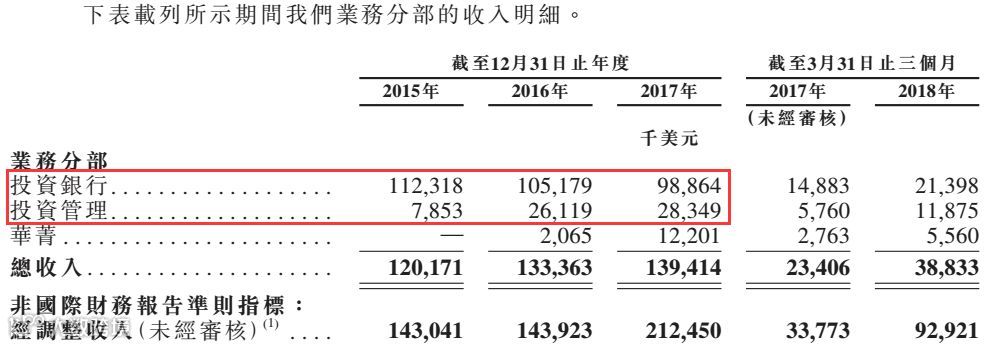 根据招股书显示,华兴资本2017年经调整后收入为2.12亿美元,同比增长47.6%,2018年一季度调整后收入更是达到9292万美元,同比猛增了1.75倍;在净利润方面,受益于投资银行及投资管理业务成长迅速,今年一季度经调整后净利润达3567万美元,同比爆增了4.22倍,华兴2017年收入与2018年一季度收入增幅同比均创历史新高。