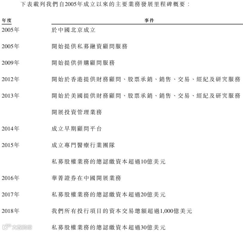 下表载列华兴资本自2005年成立以来的主要业务发展里程碑概要︰