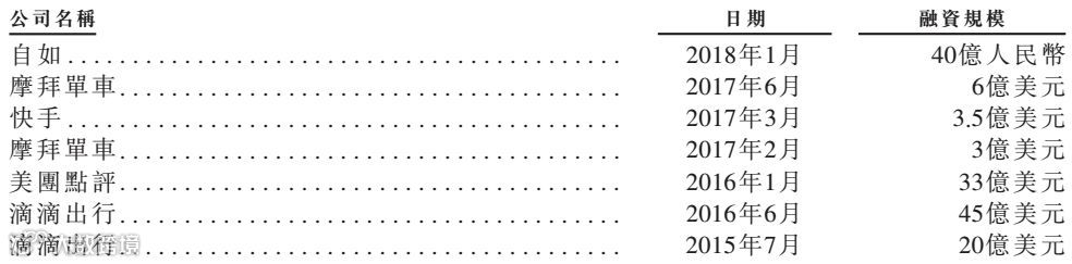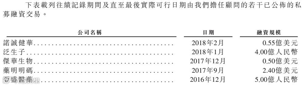 下表载列部分往绩记录期间及直至最后实际可行日期提供顾问服务的融资1亿美元以上的已公布私募融资交易。