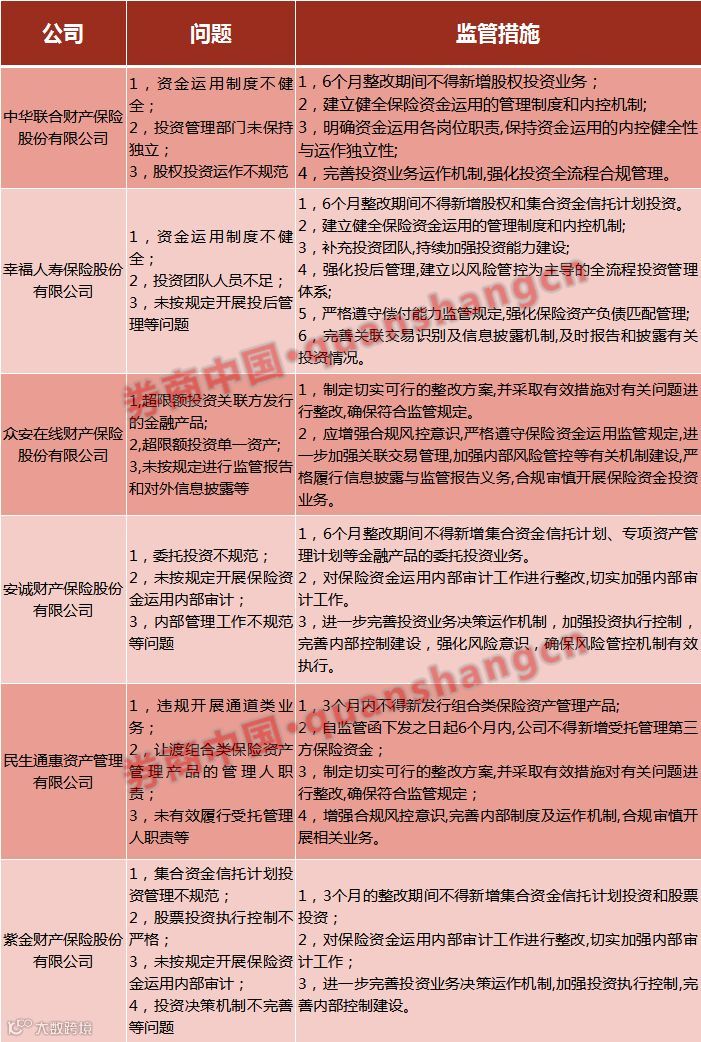 比如,中华财险在开展个别项目的直接股权投资时,未进行完善的尽职调查及合规评估。幸福人寿2016年第四季度、2017年第一季度在上季末偿付能力充足率不足120%的情况下,开展股权、集合资金信托计划投资;部分集合资金信托计划投资未按规定报告关联交易等情况。