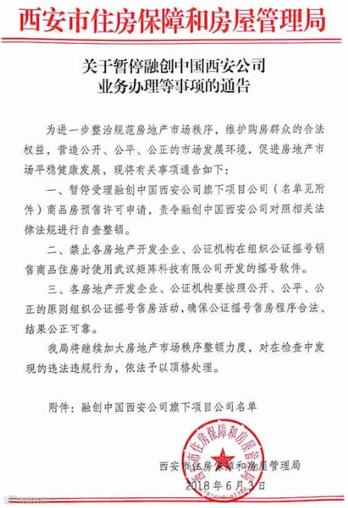 今天,西安市住房保障和房屋管理局公告,暂停受理融创中国西安公司旗下12家项目公司商品房预售许可申请,责令融创中国西安公司对照相关法律法规进行自查整顿。禁止各房地产开发企业、公证机构在组织公证摇号销售商品住房时使用武汉矩阵科技有限公司开发的摇号软件。