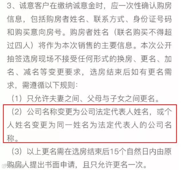 在公布的销售方案中规定,除了允许夫妻之间以及父母与子女之间更名之外,公司名称变更为公司法定代表人姓名,或者个人姓名变更为同一姓名为法定代表人的公司名称。