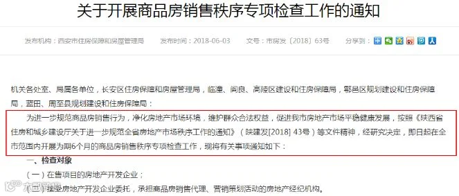 此外,受此次事件影响,西安市住房保障和房屋管理局公告,6月3日起开展为期6个月的商品房销售秩序专项检查工作。