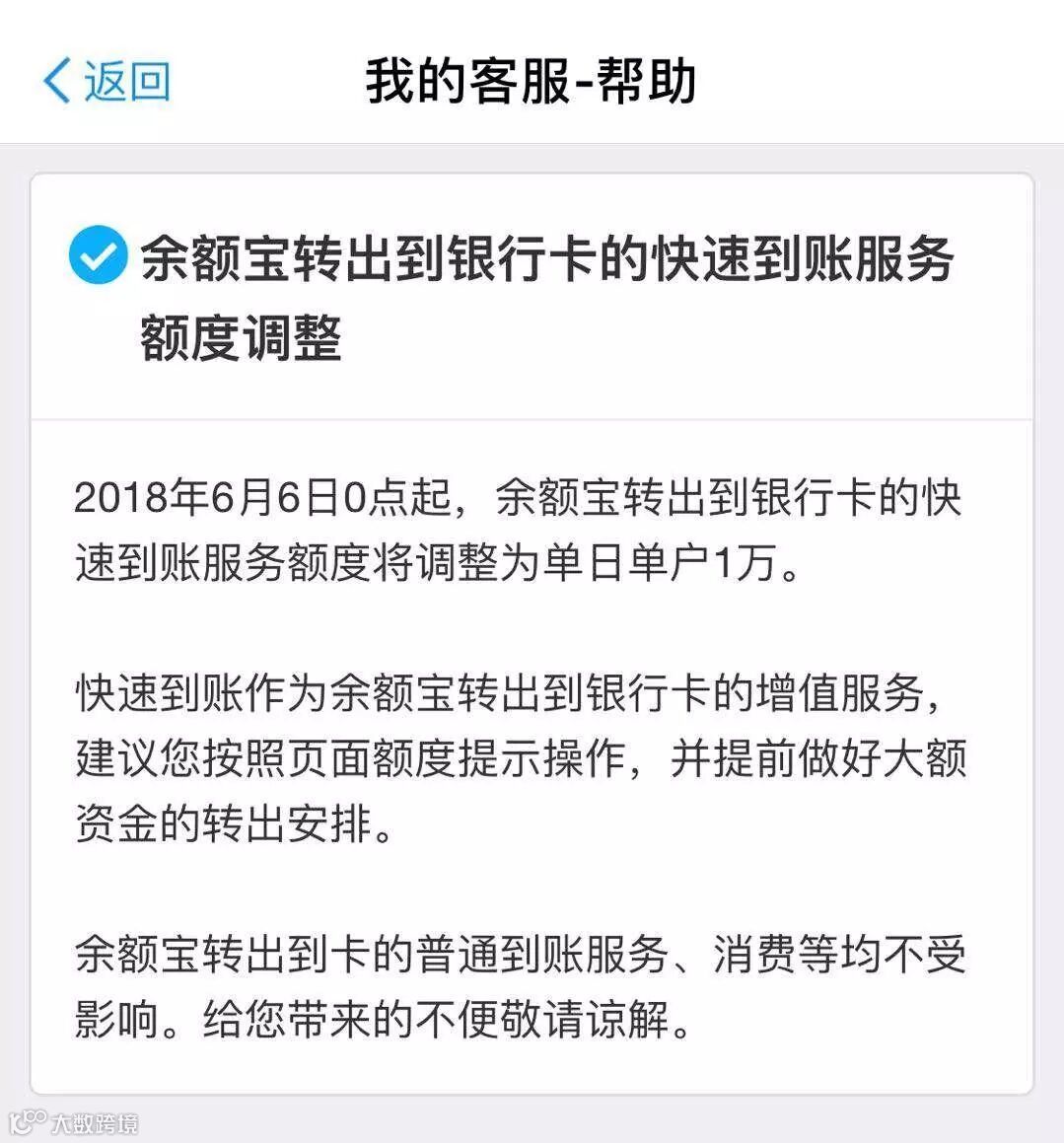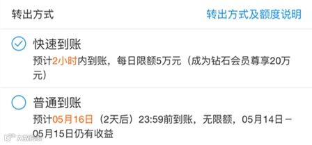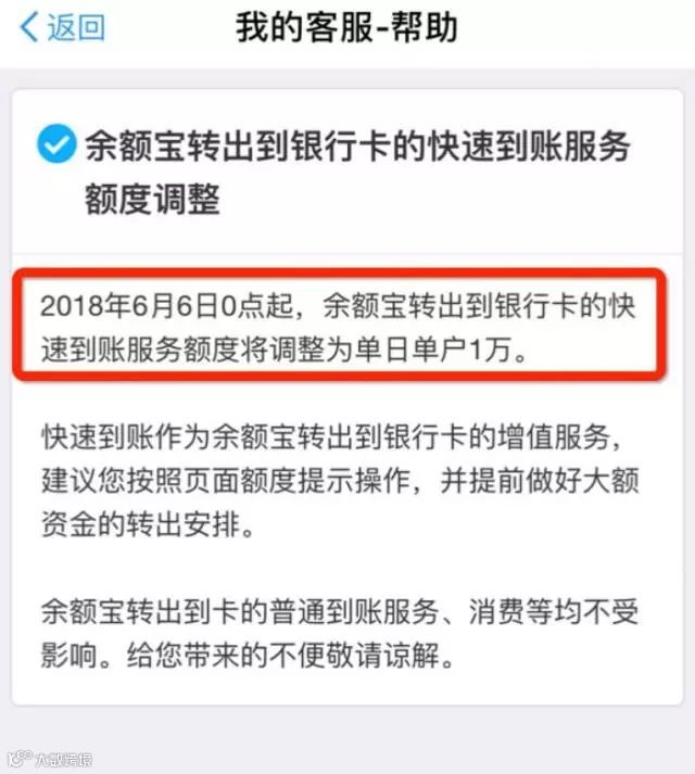 5月14日,余额宝发布公告称:从下个月也就是6月6日0点开始,余额宝转出到银行卡当日快速到账额度有所调整,从每日限额5万元调整到1万元。