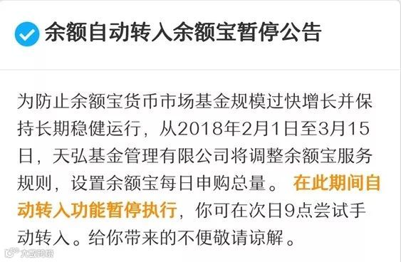 2018年1月31日,支付宝发布《余额自动转入余额宝暂停公告》,2月1日起取消自动转入功能,且设置余额宝每日申购总量,当天购完为止。