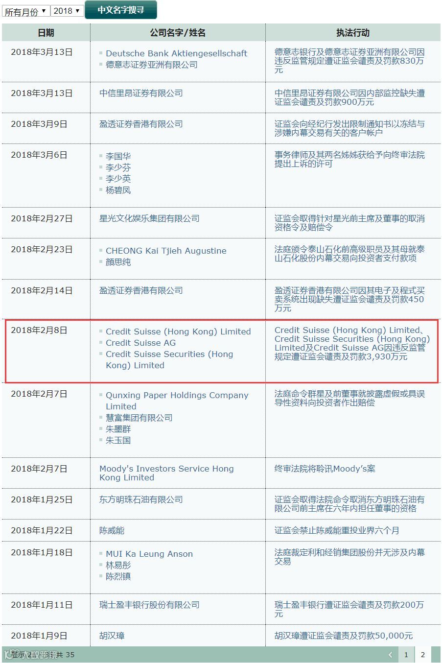 2月8日,Credit Suisse(Hong Kong)Limited(瑞士信贷香港)及其关联公司因违反监管规定遭证监会谴责及罚款3930万港元。
