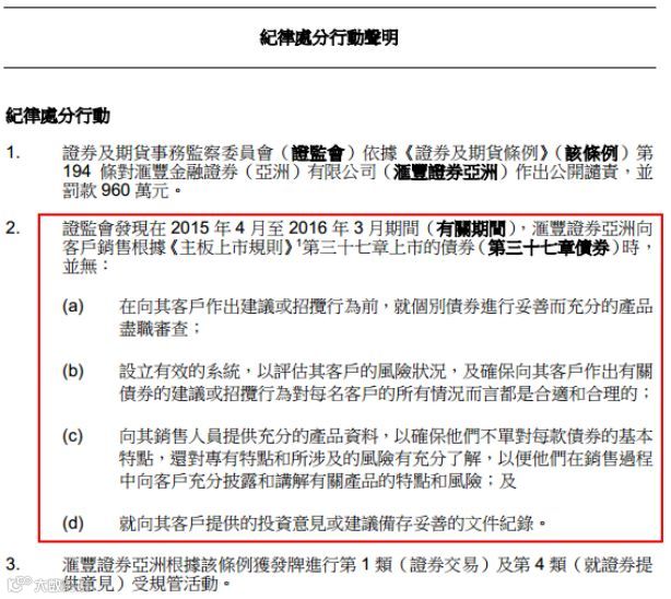 SFC官网显示,因汇丰证券亚洲的债券销售手法出现系统性缺失,对其作出谴责并罚款960万港币。