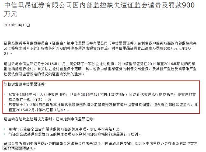 3月13日,中信里昂证券有限公司因内部监控缺失遭证监会谴责及罚款900万港元。中信里昂证券是中信证券子公司,持有1号牌、4号牌和7号牌(提供自动化交易服务)。