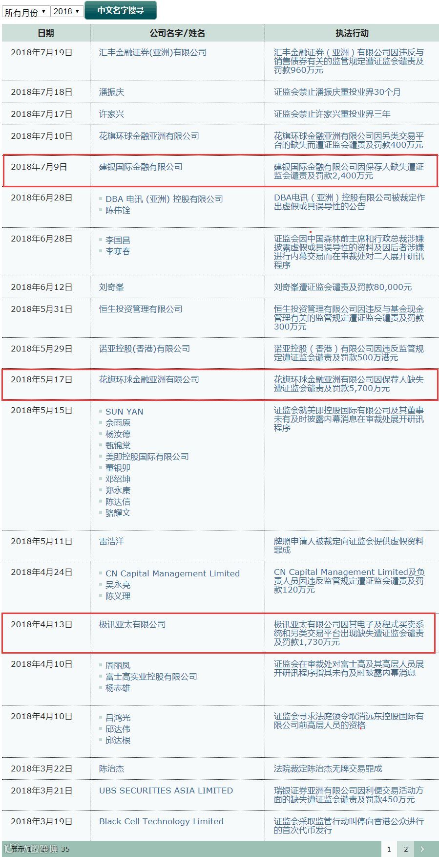 今年以来,SFC重拳出击,打击各种违法违规行为。共开出了35张罚单,仅7月份,就开出了5张罚单。全年处罚金额超过1000万港元的“大单”有4张,分别是: