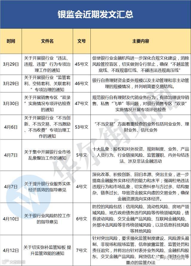 比如,短短两周,银监会就火速发布了8个文件,内容涵盖提升银行业服务实体经济质效、银行业市场乱象整治、银行业风险防控、弥补监管短板、开展“三违反”、“三套利”、“四不当”专项治理等方面,开创“史上最严银行业监管季”。下图是由华尔街见闻整理的银监会近期发文汇总: