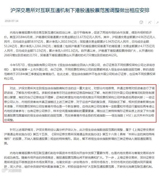 因此,沪深交易所经认真分析评估认为,此次恒生综合指数选股范围的调整,属于相关规定的特殊情形。因此,暂不将恒生综合指数新增的三类证券纳入港股通股票范围。