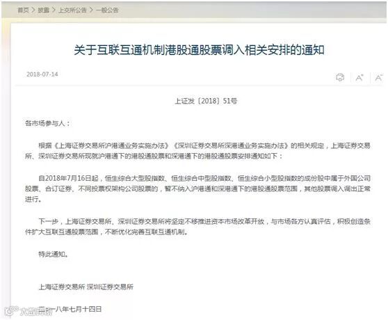 沪深交易所通知,自7月16日起,恒生综合大型股指数、恒生综合中型股指数、恒生综合小型股指数的成分股中属于外国公司股票、合订证券、不同投票权架构公司股票的,暂不纳入沪港通和深港通下的港股通股票范围。