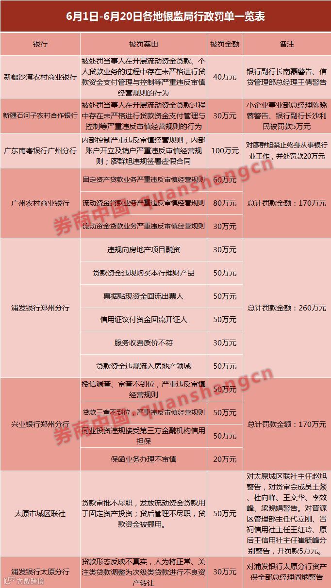 6月20日正好是年初原银监会启动的进一步深化整治银行业市场乱象检查的截止日。随着各地银监局进场检查的先后结束,对银行开出的行政罚单也陆续公布。