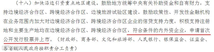 此外,《通知》还提出,积极支持注册地和主要生产地都在边境经济合作区、跨境经济合作区,符合条件的内外资企业,申请首次公开发行股票并上市。