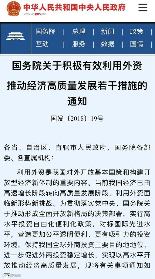 国务院这份《国务院关于积极有效利用外资推动经济高质量发展若干措施的通知》(国发〔2018〕19号)中明确这些与资本市场密切关注的重点内容。