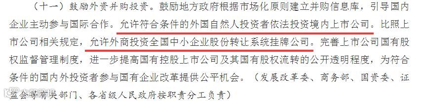 与此同时,《通知》还指出,比照上市公司相关规定,允许外商投资全国中小企业股份转让系统挂牌公司。
