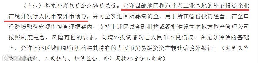 6、允许西部地区和东北老工业基地的外商投资企业在境外发行人民币或外币债券,并可全额汇回所募集资金,用于所在省份投资经营。