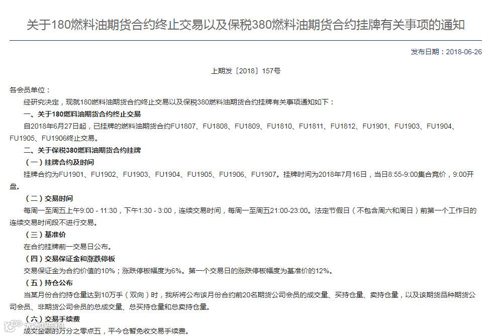 根据上期所相关通知,自2018年6月27日起,已挂牌的燃料油期货合约终止交易。修订后的保税380燃料油期货合约将于2018年7月16日正式挂牌。