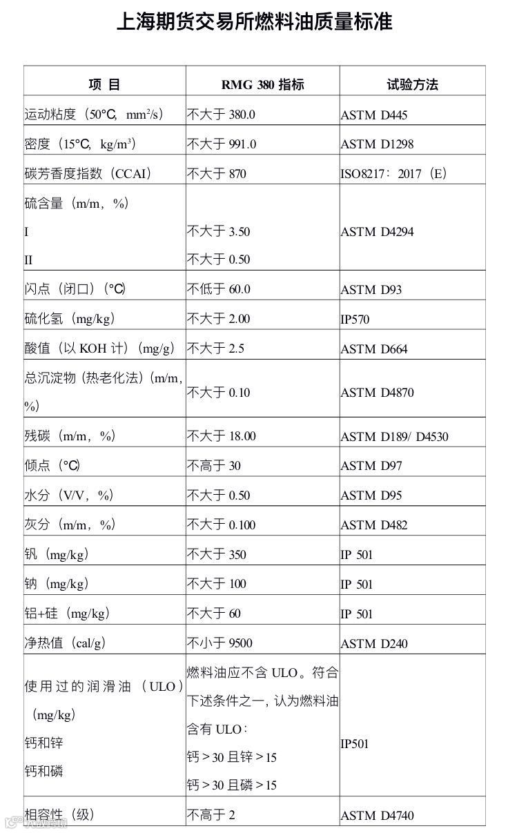 四、交割品级“180CST燃料油(具体质量规定见附件)或质量优于该标准的其他燃料油”修改为:“RMG 380船用燃料油(硫含量为I级、II级)或者质量优于该标准的船用燃料油(具体质量规定见附件)”;
