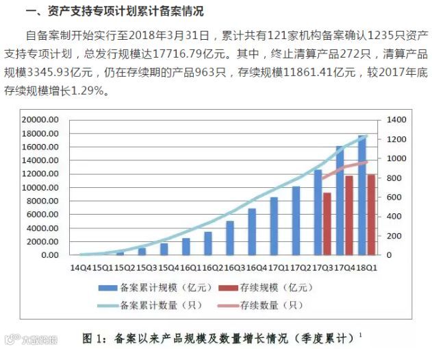 据中国基金业协会的数据显示,截至2017年末,累计共有118家机构备案确认1125只资产支持专项计划,总发行规模达1.61万亿,同比增长了133.56%。其中,终止清算210只,清算规模2323.20亿元,仍在存续期的产品915只,存续规模1.17万亿。