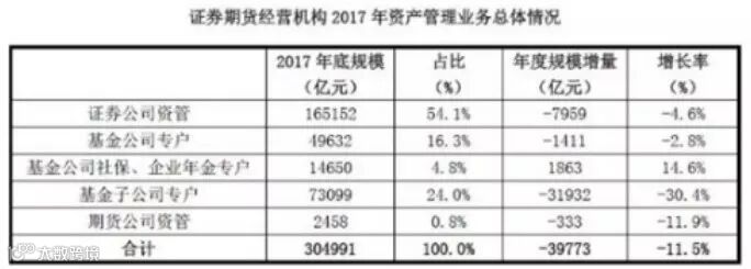 数据显示,管理规模曾接近19万亿的券商资管,从去年二季度开始告别增长,在“降杠杆、去通道”的监管环境下,单个季度就缩水6700亿。2017年末,券商资管规模进一步下降,比2016年底减少了7959亿元。