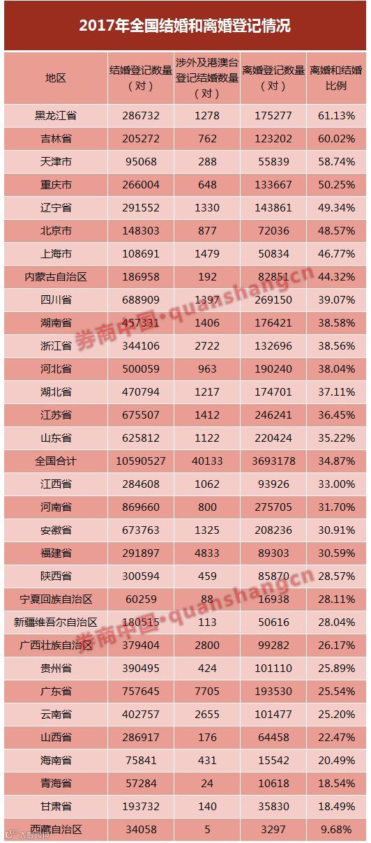 券商中国记者从民政部网站获取的数据显示,截至去年底,全国共计结婚登记10590527对,离婚登记3693178对。从全国省份排名来看,离结比排名居前的是黑龙江(61.13%);吉林(60.02%);天津(58.74%),北京和上海仅排在第六七位。