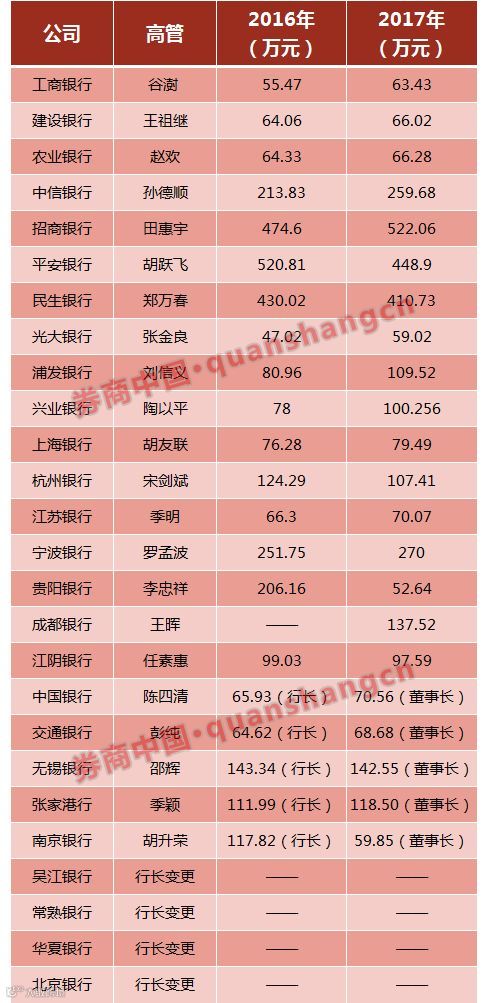 平安银行行长胡跃飞薪酬由520.81万降至448.9万,最高薪酬之位变成了招商银行行长田惠宇的522.06万。