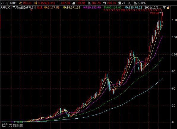 紧接着在6月5日,苹果公司再次上涨0.77%、收报193.31美元,盘中创下193.94美元的历史新高,收盘市值达到9501亿元,距离万亿美元只差5.25%的涨幅。