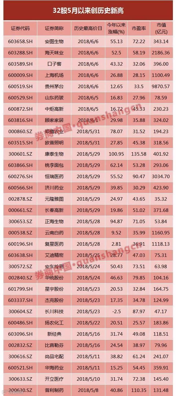就积极的一面来看,据券商中国记者统计,剔除上市未满一年的次新股,包括贵州茅台在内,5月以来共有32只个股创下了历史新高。