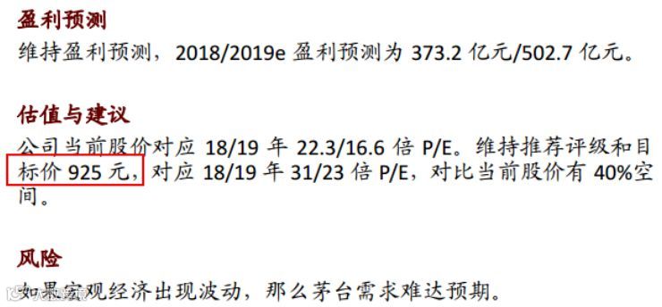 在一季报发布后,中金公司对贵州茅台发出推荐报告,给予925元的目标价,对应2018年业绩31倍市盈率、对应2019年业绩23倍市盈率,目标价较研报发布时有40%的涨幅空间。