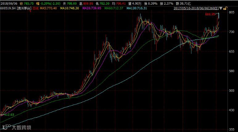 A股市场白马股今日也集体走强,贵州茅台内日下跌0.29%、收报785.5元,盘中突破800元大关、刷新历史高点,市值在一度重回万亿元规模。参照既有券商研报,当前最乐观的分析师已经对贵州茅台看高至925元。