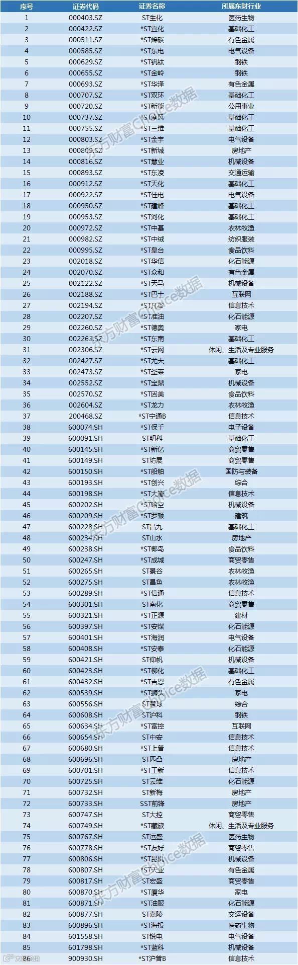 东方财富Choice数据显示,从有退市风险的个股来看,A股目前共有86只。