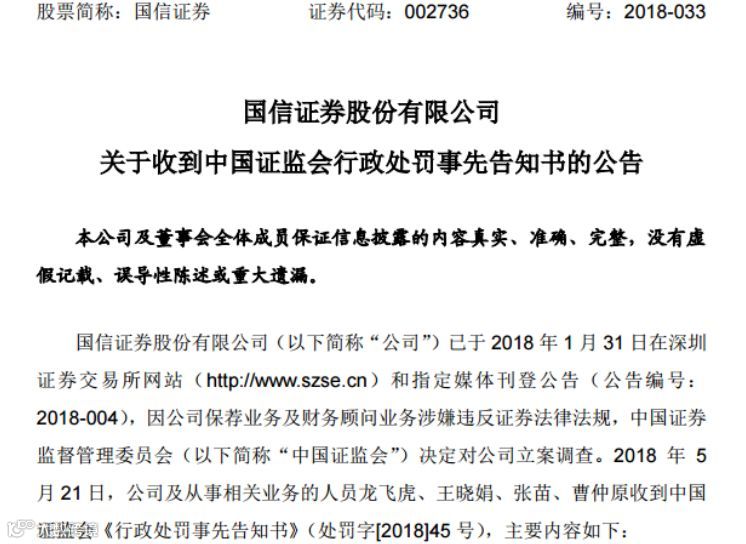据了解,今日国信证券公告的处罚事先通知书,属于预处罚,正式处罚还没有最终确定。国信证券及龙飞虎、王晓娟、张苗、曹仲原享有陈述、申辩和要求听证的权利。国信证券在公告称,将在收到正式的处罚决定后及时披露相关信息。