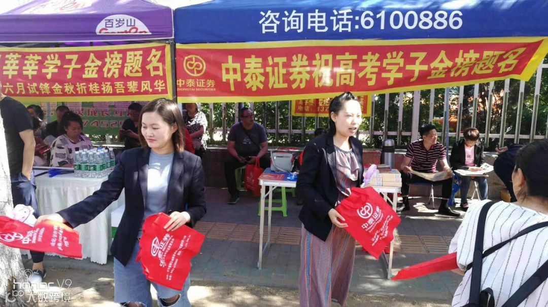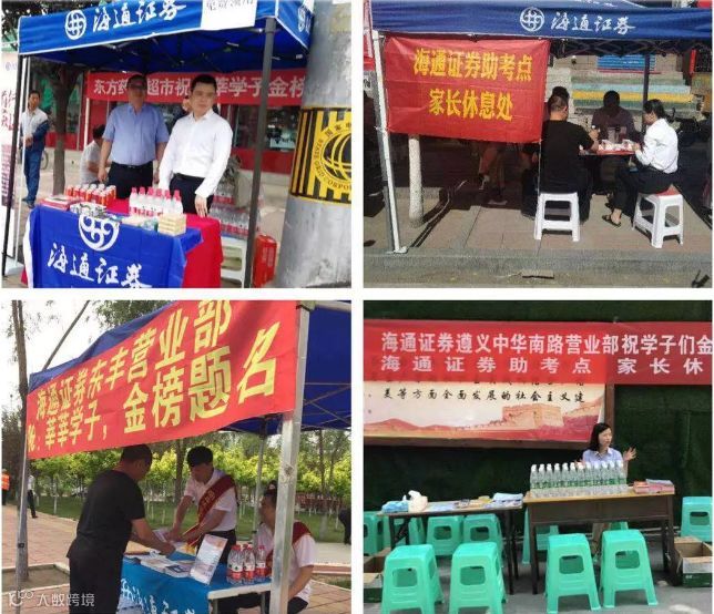 中泰证券的分支机构在各个考点前搭建驻点,为考生和家长提供服务。