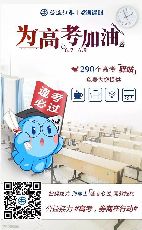 暖心的在海报内提示家长们海通证券在全国设立了290个高考“驿站”,每个“驿站”免费提供热水、座椅、WIFI和空调。