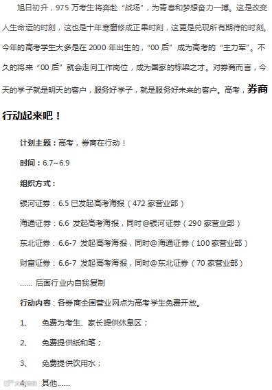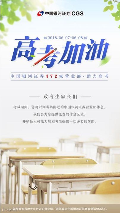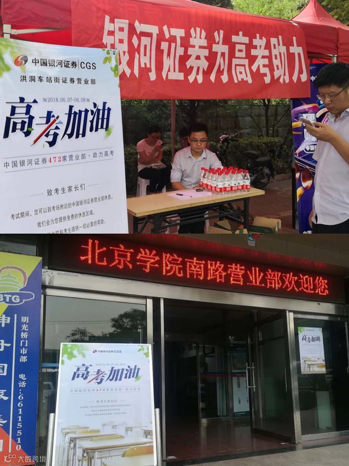 中国银河证券472家营业部助力高考,6月7日-6月8日,要求各分支机构在营业部明显位置张贴活动海报,并准备考生和家长可能用到的物品,为考生及家长准备饮用水、休息区,并在力所能及的范围内为考生和家长提供最大的便利。