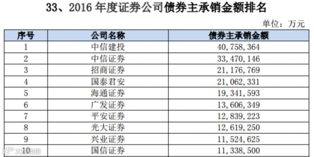 年报显示,中信建投2016年债券主承销金额和债券承销佣金收入位列第一;2017年境内债券主承销家数与承销金额行业排名均为第二,其中公司债券承销金额与家数均行业排名第一;2017年担任主承销商的境内股权融资项目数量行业排名第三,承销金额行业排名第四,其中IPO主承销家数行业排名第五,行业排名第四。