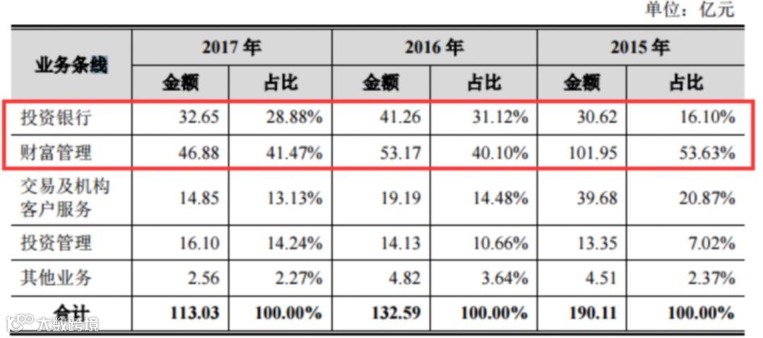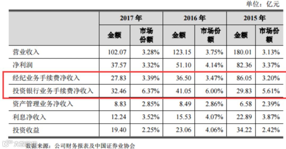 2015年至2017年,中信建投的投资银行业务手续费及佣金净收入分别为30.7亿元、41.63亿元和33.48亿元,分别占中信建投营业收入的比重为16.15%、31.40%和29.62%。
