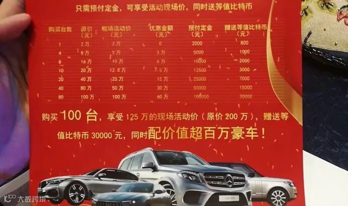 数日前在深圳举办的某活动上,进行了有买有送的大型促销活动。和以往大多数的促销活动不同,这次促销的商品是曾风靡一时的比特币矿机;促销力度也很大,购买100台,享受125万的现场活动价(原价200万),赠送等值比特币30000元之外,再配价值超百万豪车。