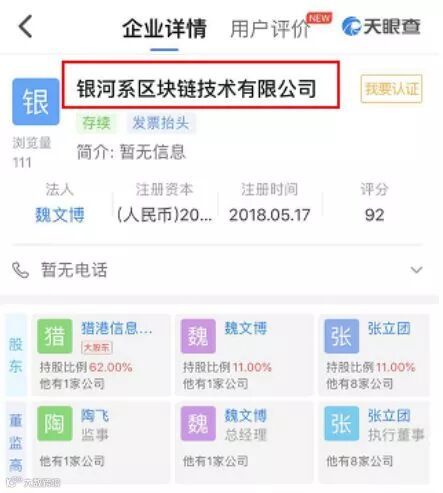 5月17日,一家名为“银河系区块链技术有限公司”在深圳注册,大股东为猎港信息技术(上海)有限公司,注册地址在深圳前海,经营范围包括区块链技术开发,人工智能技术开发与推广等。