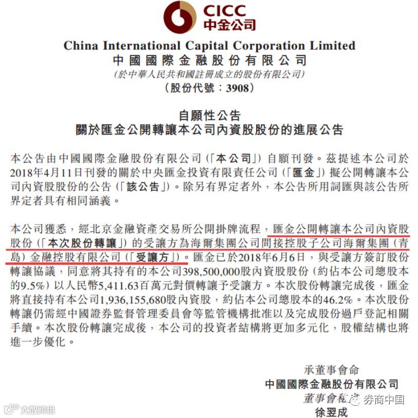 6月7日晚间,中金公司在港交所发布公告称,中央汇金已于2018年6月6日,与海尔金控签订股份转让协议,中金公司3.985亿股以54.12亿元对价转让给海尔金控。此次股份转让完成后,海尔金控将成为中金公司新第二大股东,持股比例9.5%;此外,中央汇金仍是中金公司第一大股东,持股比例由55.68%减少至46.2%。