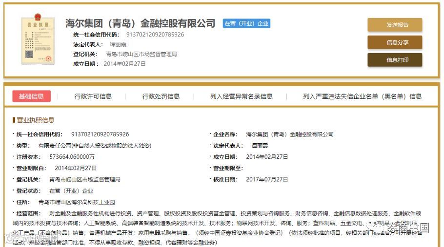 公开信息显示,海尔金控于2014年2月27日成立,注册资本57.37亿元。海尔电器持有海尔金控100%股份,海尔集团又是海尔电器的控股股东,持股比例51.2%。海尔集团执行副总裁兼首席财务官谭丽霞,担任海尔金控董事长和法定代表人。