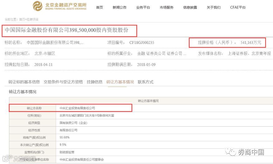 今年4月11日,中金公司的控股股东中央汇金,在北京金融资产交易所公开挂牌转让其所持有的中金公司3.985亿股内资股股份(约占中金公司总股本的9.5%),评估值为50.5亿元,挂牌价为54.12亿元,要求一次性付款。