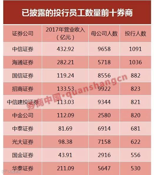 其中,投行人数最多的三家上市券商分别是:中信证券1091人、海通证券1036人、国信证券882人。若按内控人员占比十分之一计算,则上述三家券商的内控人员约百人左右。