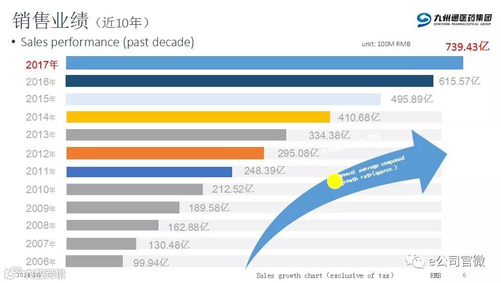 2010年上市以来,不到8年的时间里,九州通的资产规模增长近5倍、营收规模增长约2.5倍。2017年,公司营业收入739.43亿元,同比增长20.12%;净利润14.46亿元,同比增长64.87%。