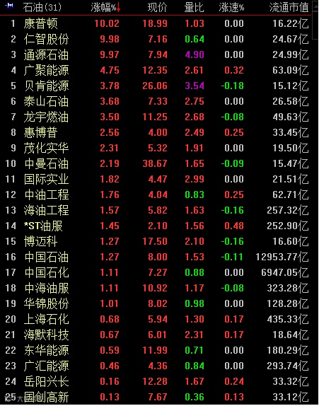 受国际油价大涨带动,今日A股市场石油板块大涨逾1%,康普顿、仁智股份、通源石油纷纷涨停,泰山石油、广聚能源、贝肯能源、龙宇燃油涨逾3%,石化双雄也纷纷上涨逾1%。